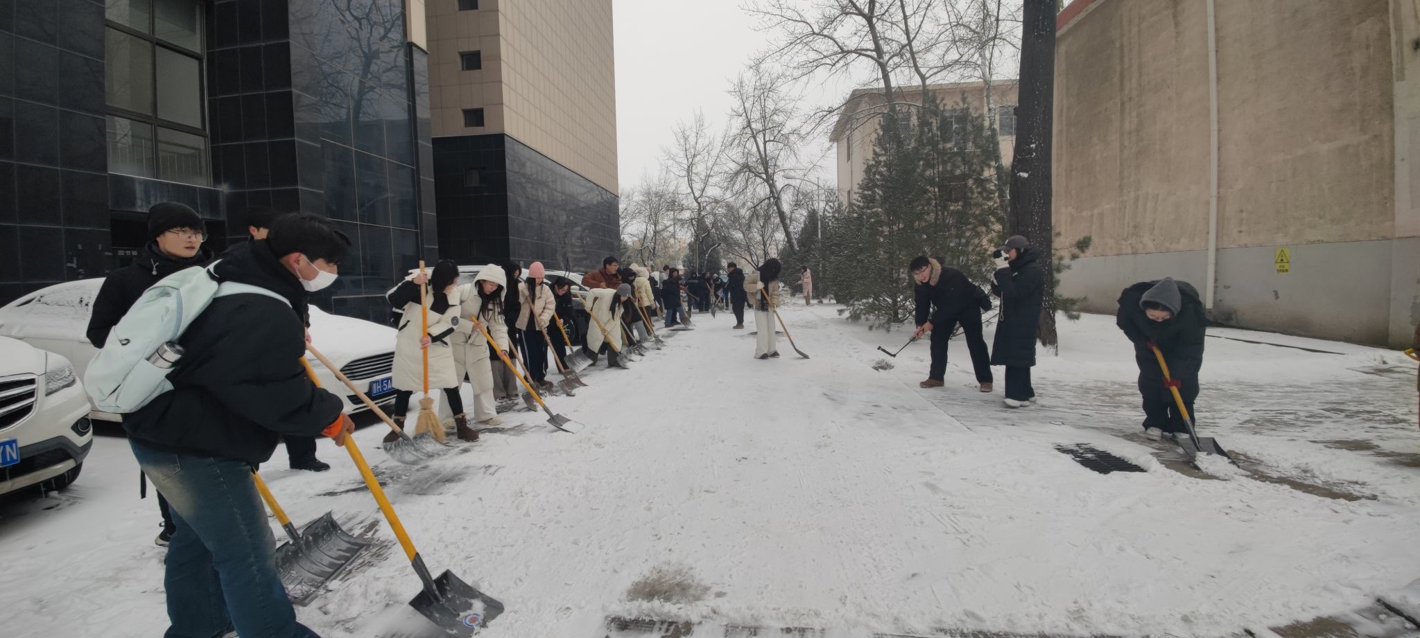 党政领导班子的带领下,学院本硕党支部学生主动响应、迅速集结,在鸿学楼(12 号教学楼)周边区域集中开展扫雪除冰专项行动。