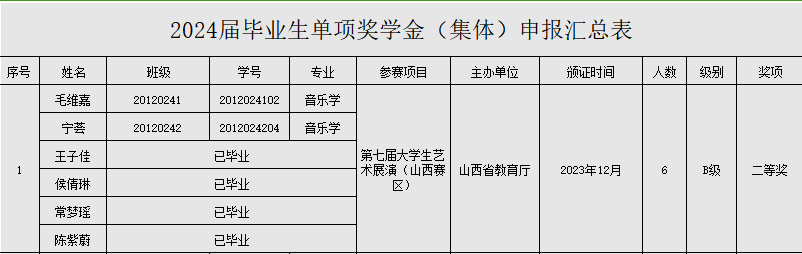 大学生奖学金评定实施细则》(校学字[2020]第11号)有关规定已评审结束。经个人申请——班级审核——学院审查,2人获得个人创新创业实践和竞赛奖学金。现将名单公示在管网及文澜苑公示栏内,公示期3天,从2024年5月19日——21日。