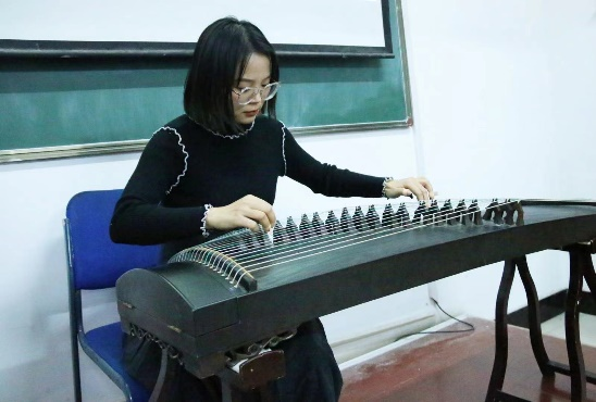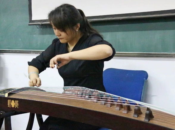 副教授陈娟老师,陈娟老师利用美育”寓教于乐”,”随风潜入夜,润物细无声”特点,从音乐赏析的最基础部分向大家讲解,通过轻松简单的听觉训练、音乐的五个维度分别让同学们走进“高山”“月光”“田园”“台风”等的音色中,感知不同的音乐形象,并以此展开想象。随后,陈娟老师亲自为大家弹琴感受筝独特的音色,为我们带来经典性的筝乐诗古筝代表曲目,并巧妙的加入人声演唱,朗诵,打破了传统的“欣赏”,让同学们以面对面的形式感受中国古筝诗词之美。此次美育沙龙得到了同学们的积极反响,同学们上课积极互动,表示对于如何欣赏音乐有了更加清晰的定位,也对中国古诗词文化产生了浓厚的兴趣。