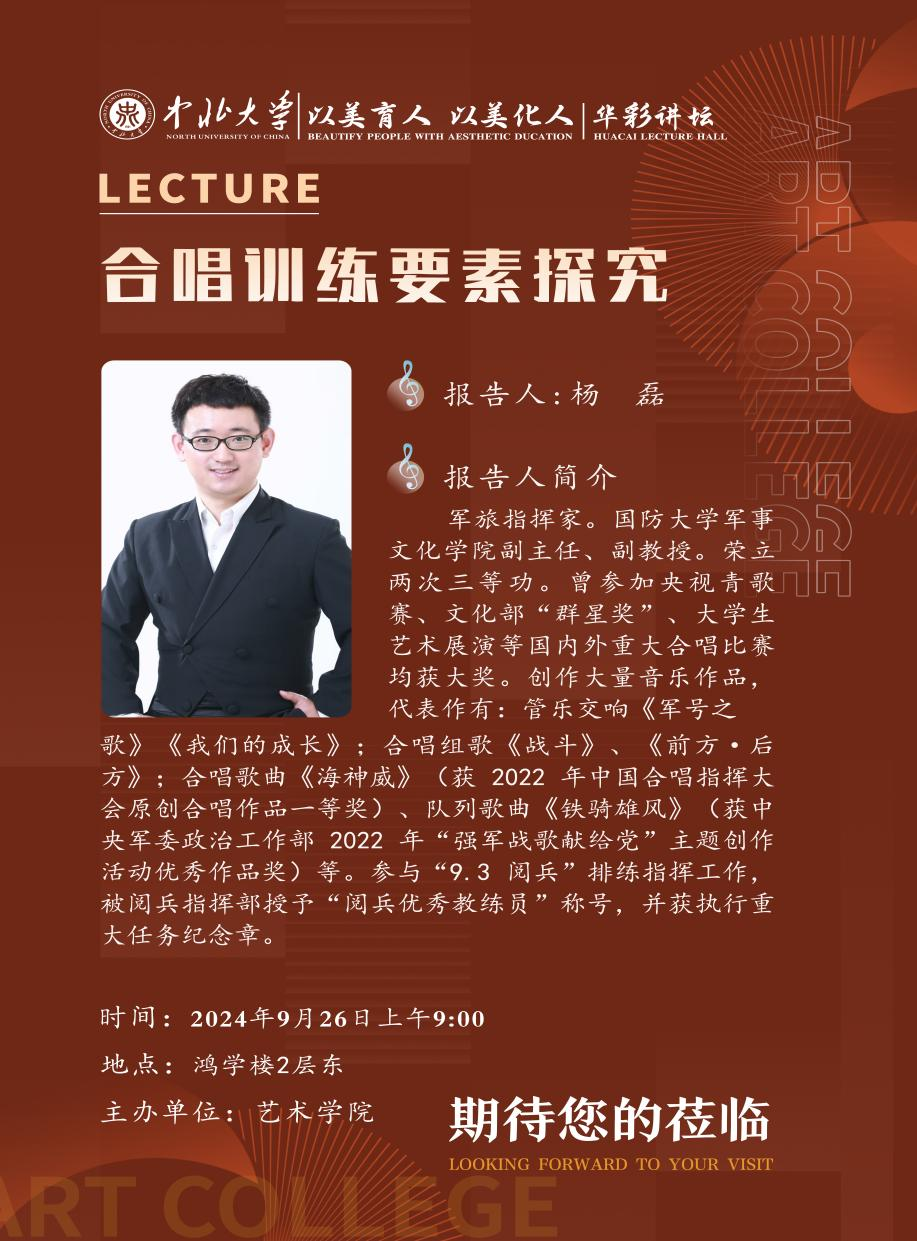 讲坛特邀国防大学军事文化学院杰出代表、享誉业界的军旅指挥家杨磊副教授担纲主讲。杨教授不仅在国际国内合唱赛事中屡摘桂冠,包括央视青歌赛金奖、文化部“群星奖”等殊荣加身,更以其卓越的指挥才华和深厚的艺术底蕴,成为合唱艺术领域的一面旗帜。尤为引人注目的是,杨教授曾亲自执棒“9.3阅兵”排练,荣获“阅兵优秀教练员”称号及执行重大任务纪念章,其国家层面的艺术贡献令人钦佩。